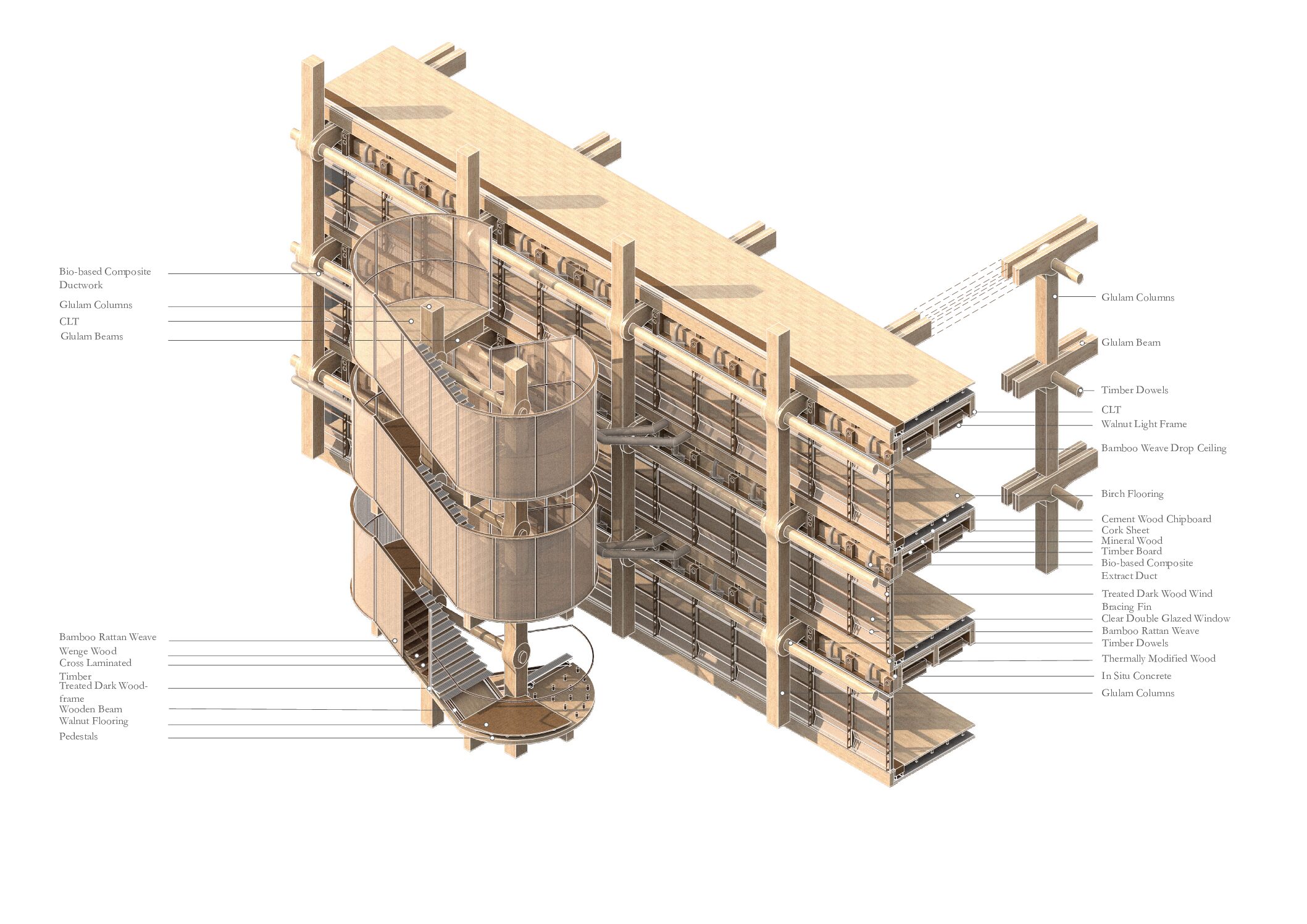 This project’s facade concept weaves together bio-based composites, bamboo, and timber construction to form a warm, breathable, and renewable building skin rooted in ecological performance.